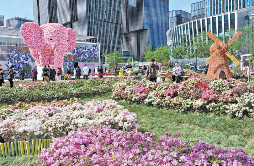丰台区丽泽金融商务区写字楼林立,花展的核心展区就坐落其间。这里鲜花错落,绣球、郁金香、蓝盆花、鲁冰花等地栽花卉有好几十种。绚烂的“莫奈花园”映在写字楼的晶莹幕墙上,美不胜收。